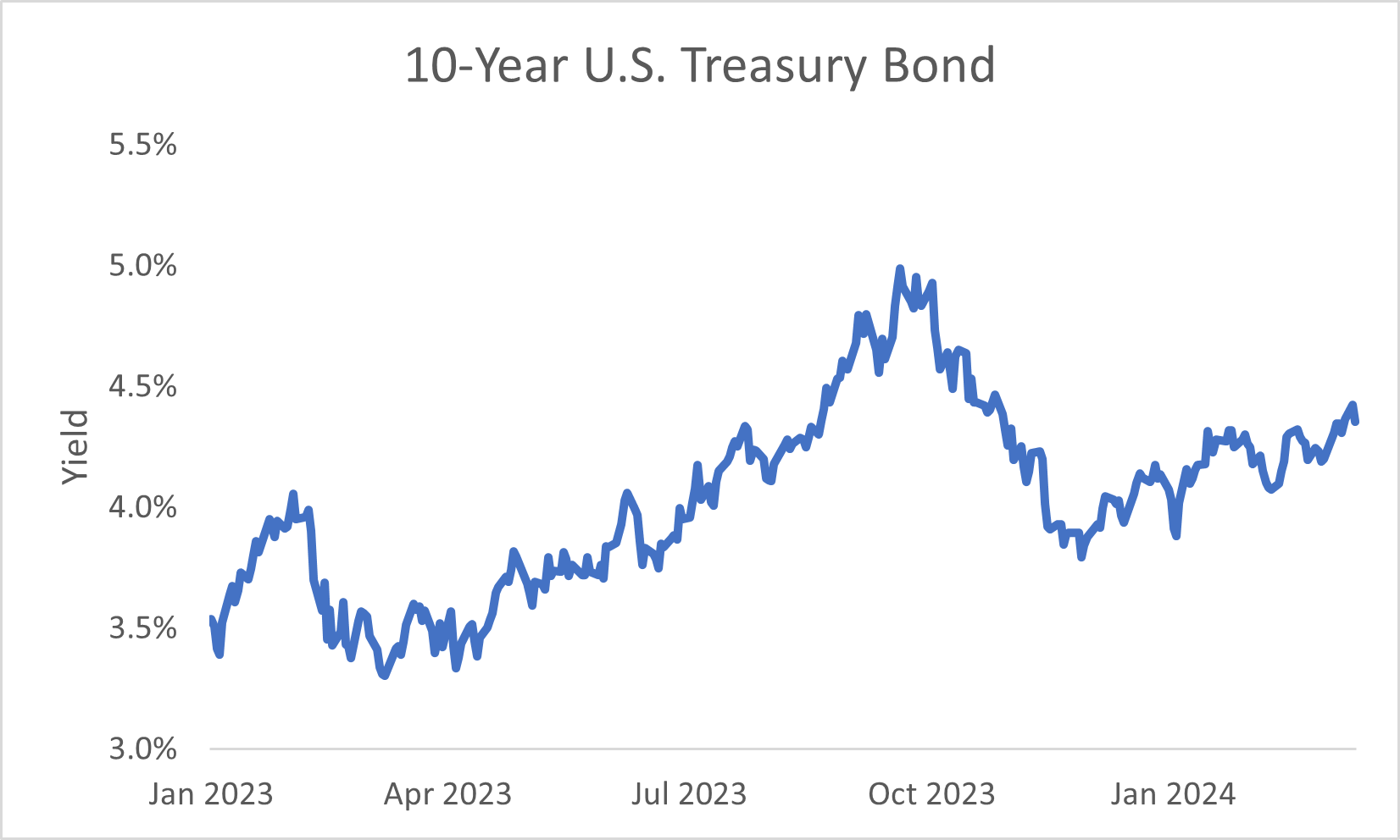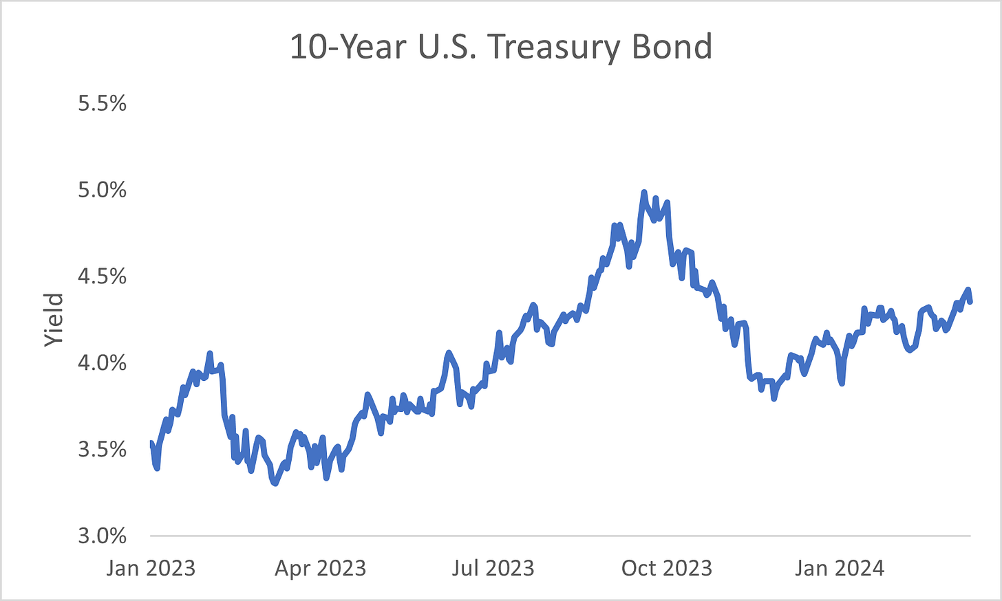 So, as those rate-cuts bets have faded, the yield on 10-year U.S. Treasuries has shot up…