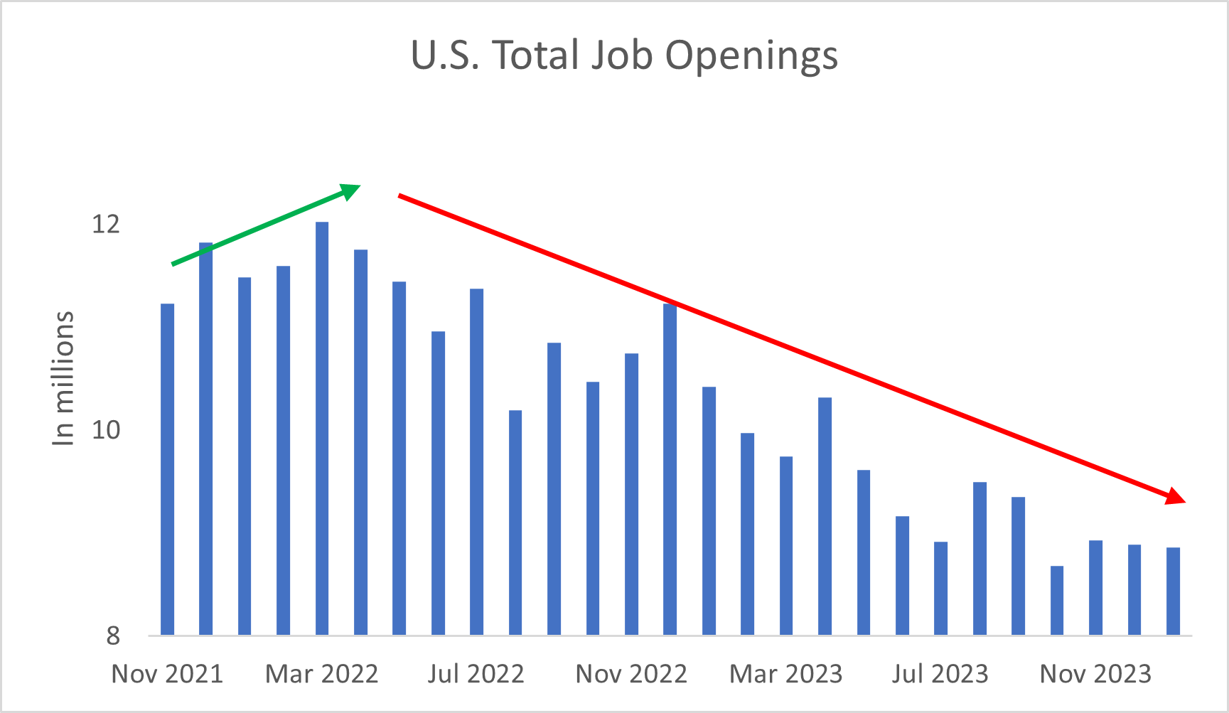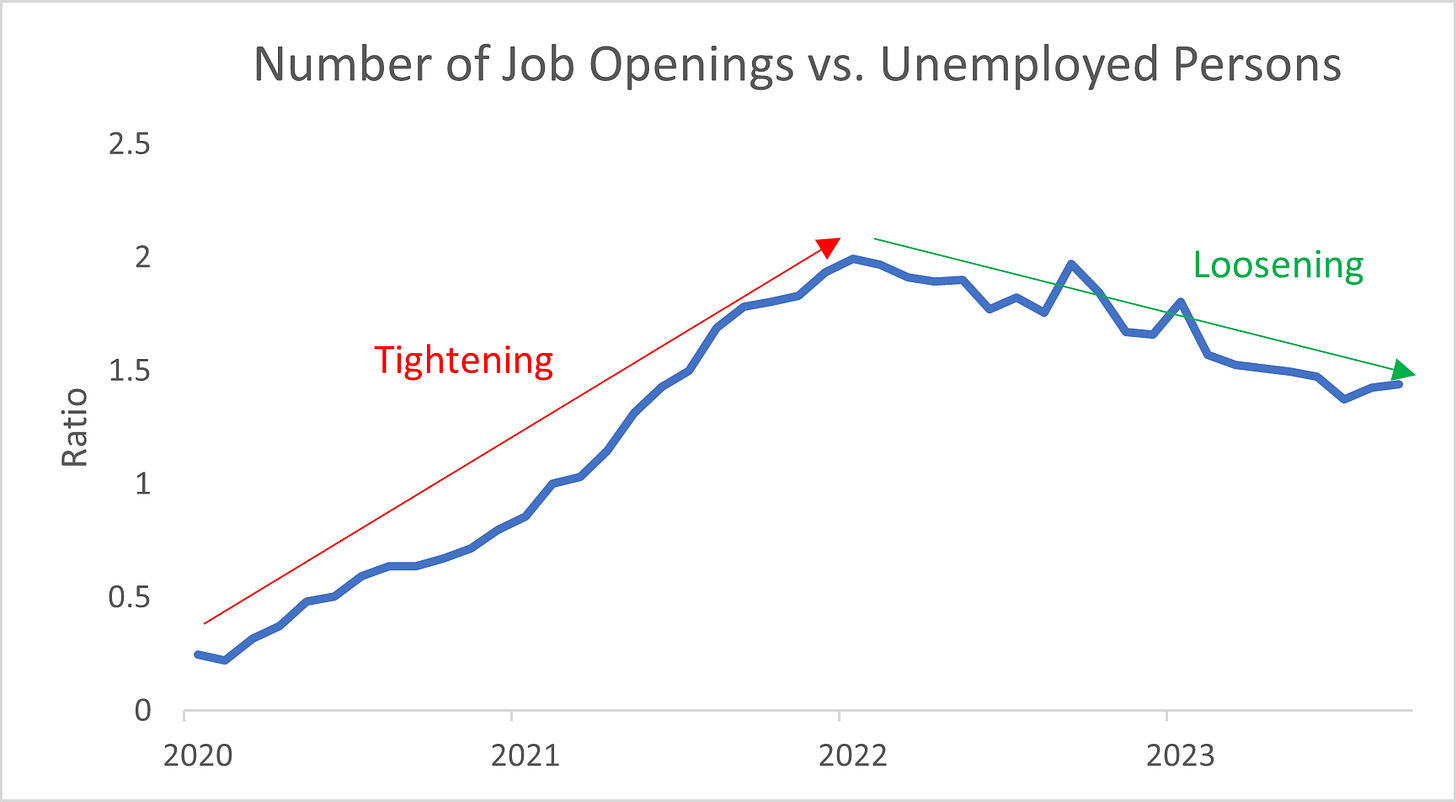 Now, the ratio isn’t quite back to the pre-pandemic level sub-1, but it’s well below the peak of 2 set in March 2022. In addition, the estimated number of available positions is well below the April 2022 peak of 12 million and headed back toward the pre-pandemic level of around 6.8 million…