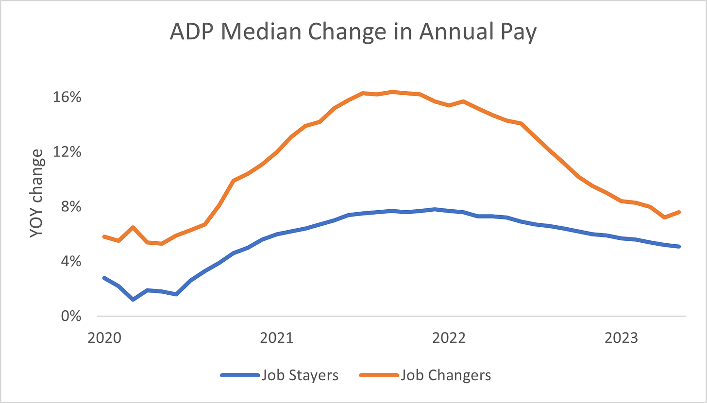 At the same time, pay increases continue to ease. According to ADP, job stayers saw a 5.1% jump while job changers experienced a 7.6% bump in compensation. Both numbers are well below their respective 7.8% and 16.4% peaks set in 2022...