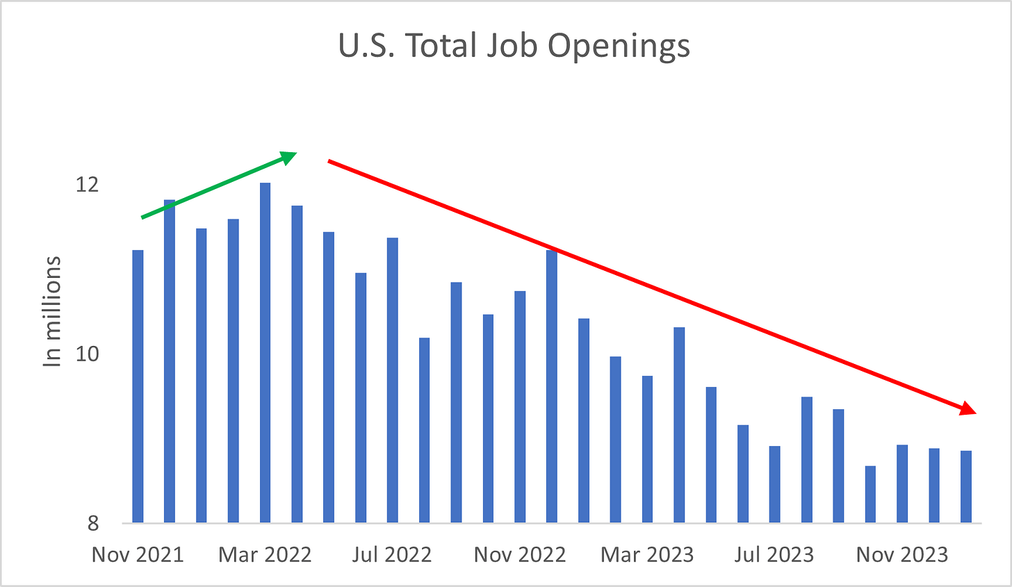 According to the BLS, the number of job openings held steady in January at 8.9 million compared to the downwardly revised number for December. That means the ratio of available jobs compared to unemployed persons is unchanged at 1.4...