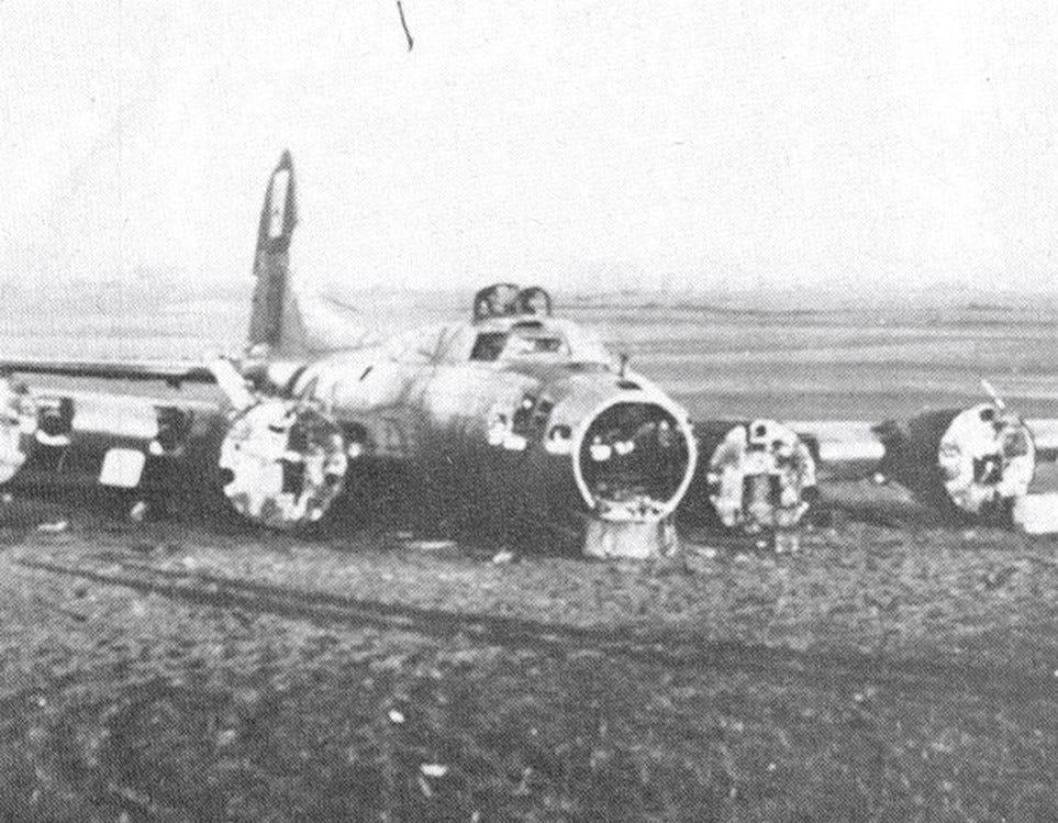 After my Pop-pop's second time going AWOL, the brass got serious: if he did not remain with his new plane and crew for the remainder of his training, he would find himself staring at desertion charges, a very serious offense. From then on, he walked the straight and narrow and the rest was history. Below is a picture of Tuff Teddie after it crashed in a field on the way back from its final mission.