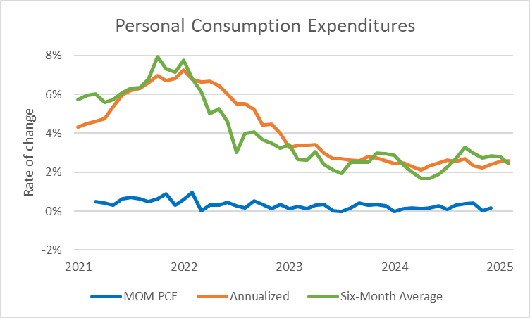 Consequently, the individual weights within PCE are less concentrated than those in CPI, making PCE less volatile. That stability reinforces the Fed’s preference. As shown in the following chart, while the pace of price increases is still above the 2% target, it has been steadily flattening out since peaking in mid-2022…