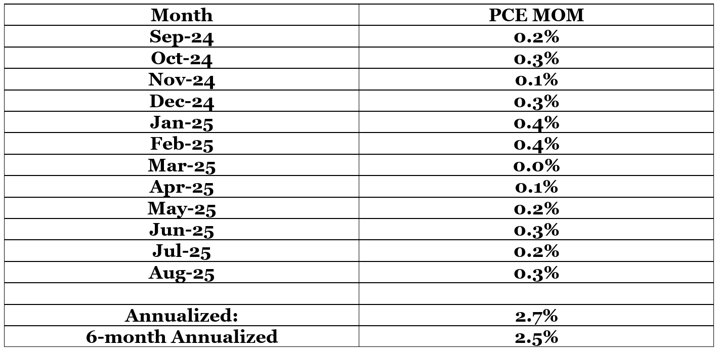 The table above details the pace of monthly PCE growth over the past year. To estimate the annualized rate when the new numbers are released at the end of this week, I substituted last August’s 0.1% growth with this year’s forecast from the Cleveland Fed. When you add up the monthly totals, the annual rate rises slightly to 2.7%.