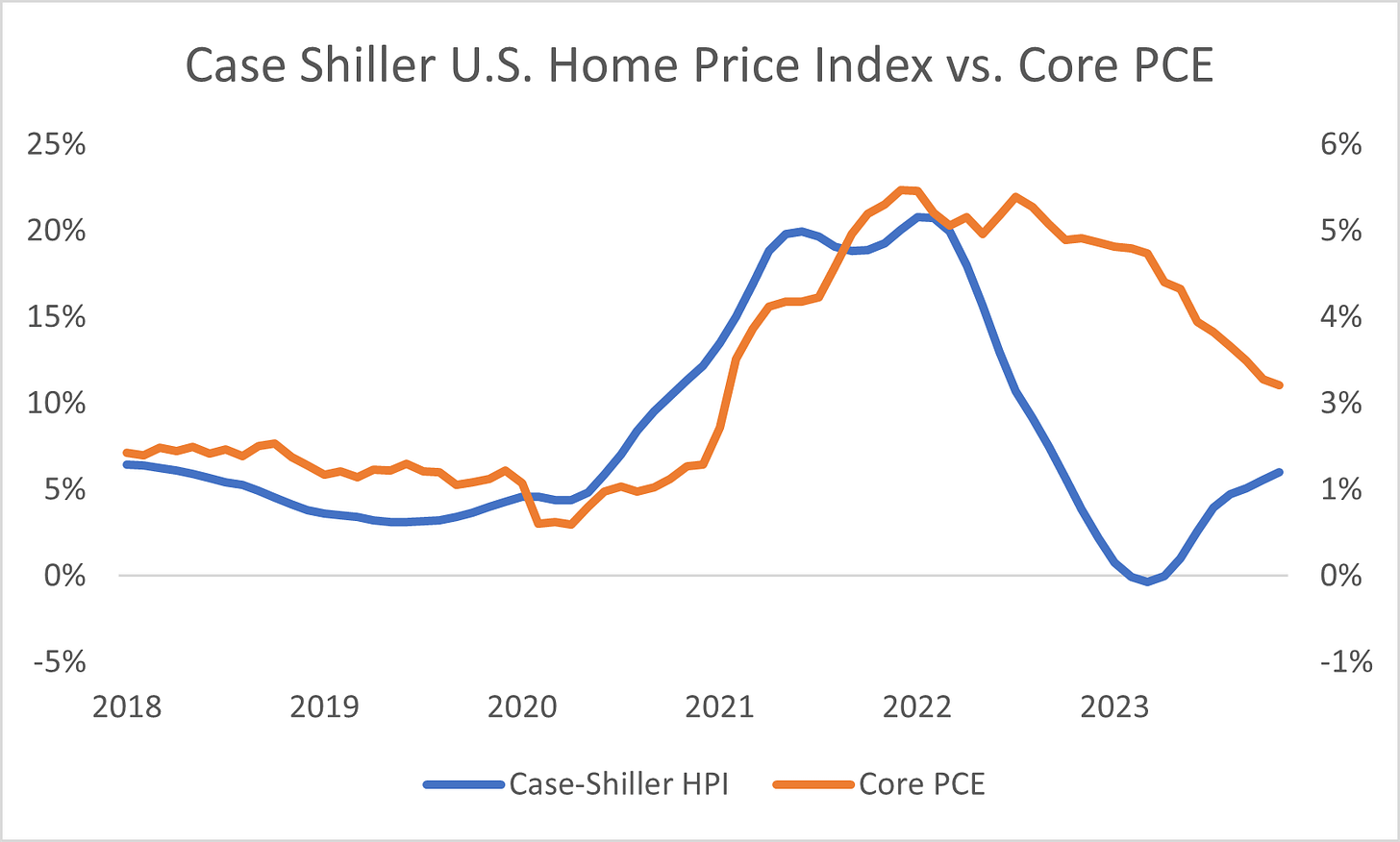 Next, let’s look at Case-Shiller’s annualized numbers compared to core PCE…
