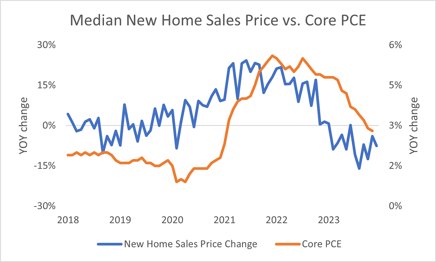 Now, look at the relationship between the annualized change in new-home prices and core PCE…