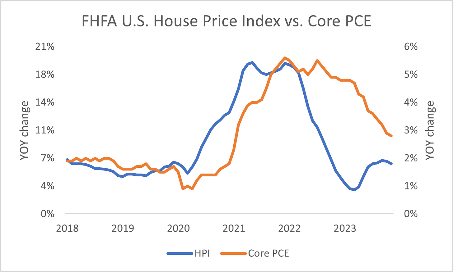 To see the broader implications of house-price shifts, let’s look at the year-over-year changes in HPI. That way we’re getting a better idea of the long-term trend versus the choppier month-to-month dynamics. And, if we’re going to gauge the interest rate outlook, we must compare the HPI data to the Federal Reserve’s preferred inflation gauge, core personal consumption expenditures (“PCE”).