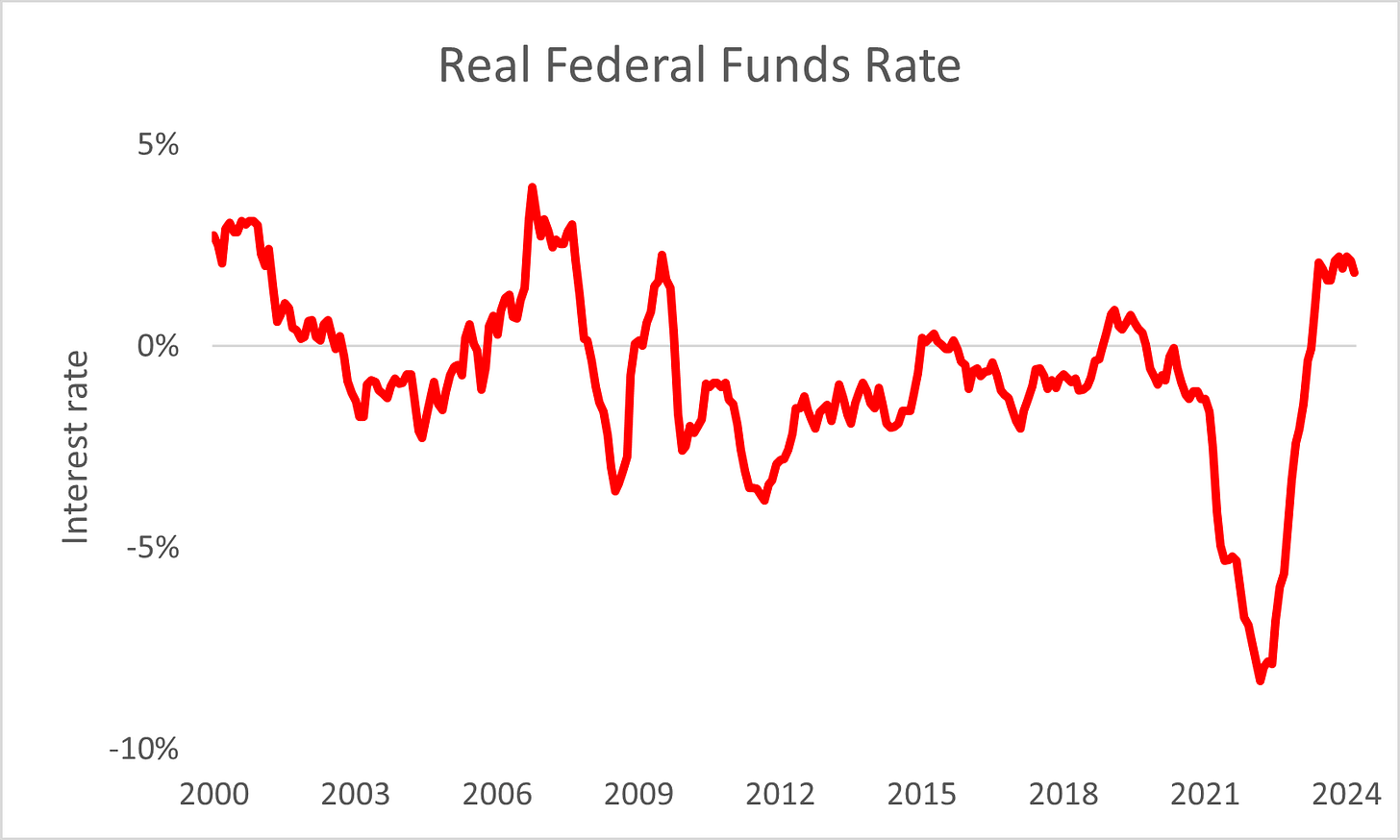 As you can see in the chart above, the real rate of interest got as low as -8.3% back in March 2022, just before the Fed started a series of rapid rate hikes. And then, after getting the number back to 2% by June of 2023, our central bank finally had the room it sought to stop raising.