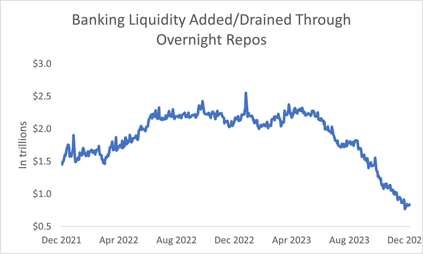 We can see this through the New York Fed’s gauge of banking liquidity added and drained via the overnight repurchase market. Repos are agreements where one financial institution agrees to buy securities from another, selling them back at a later date and at a higher price, making a return. In this case, the transactions are overnight.